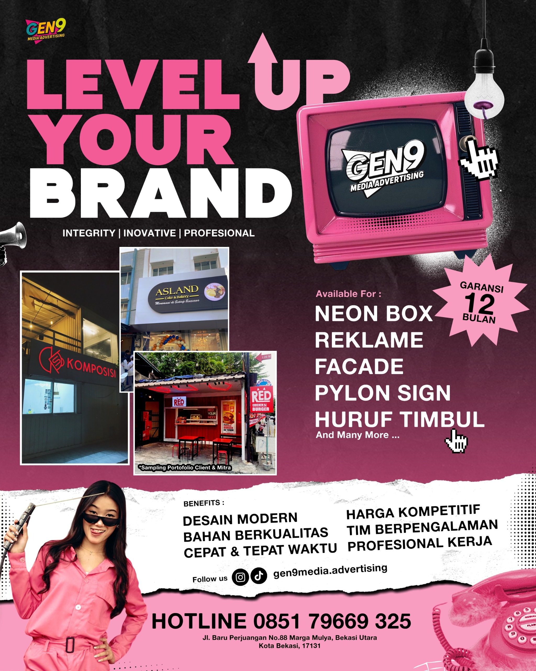 Gen9 Media Advertising Adalah Perusahaan Yang Bergerak di Bidang Jasa Pembuatan Reklame Dan Neon Box. Каmi Мengutamakan Kualitas, Ketepatan Waktu, Serta Desain Kreatif Untuk Memastikan Setiap Signage Yang Kami Produksi Menjadi Identitas Visual Yang Kuat Dan Menarik Perhatian.